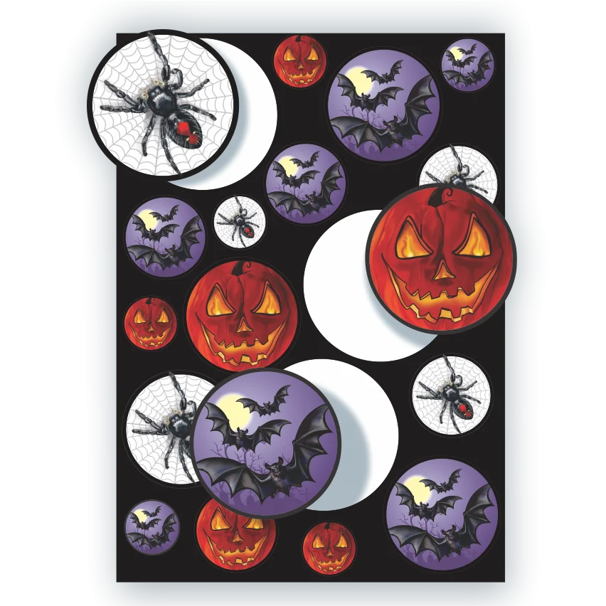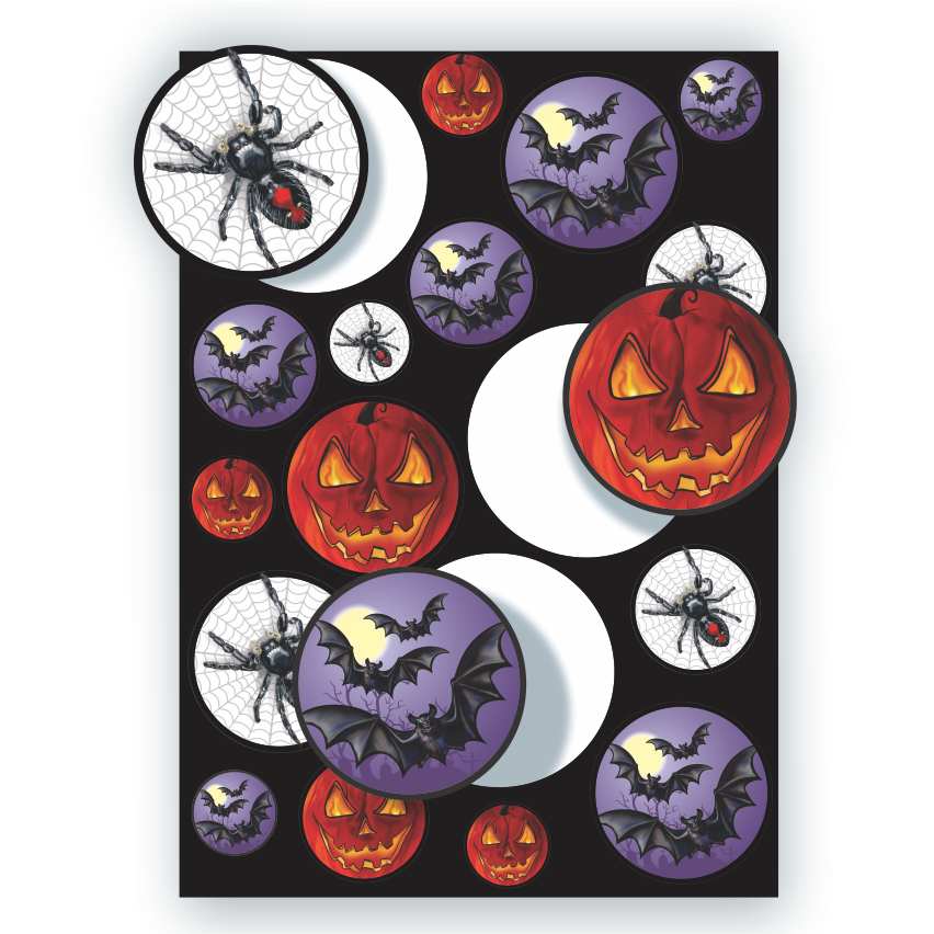 Cartela de adesivos com ilustrações temáticas de Halloween, perfeita para decoração e personalização de itens.
