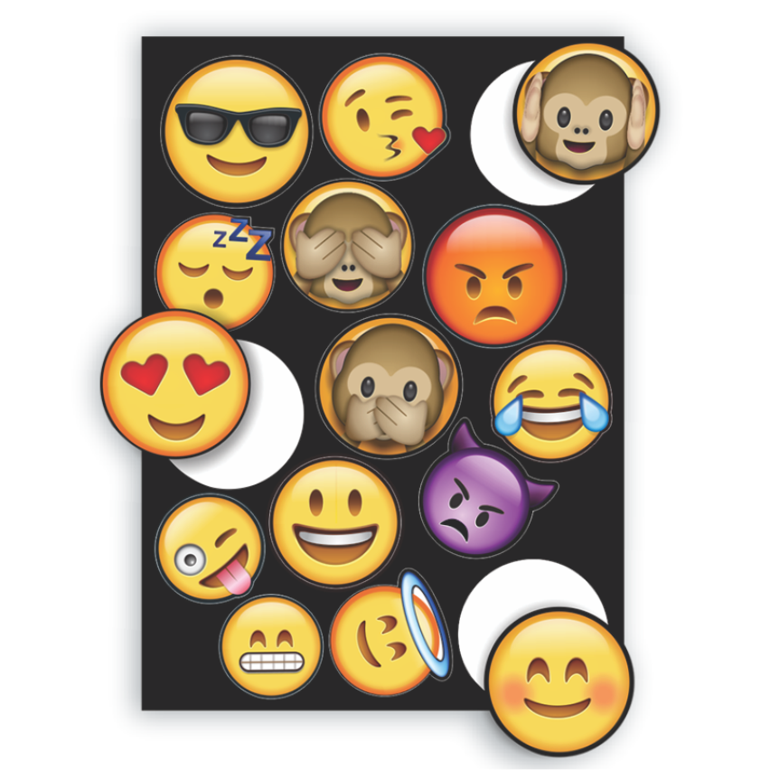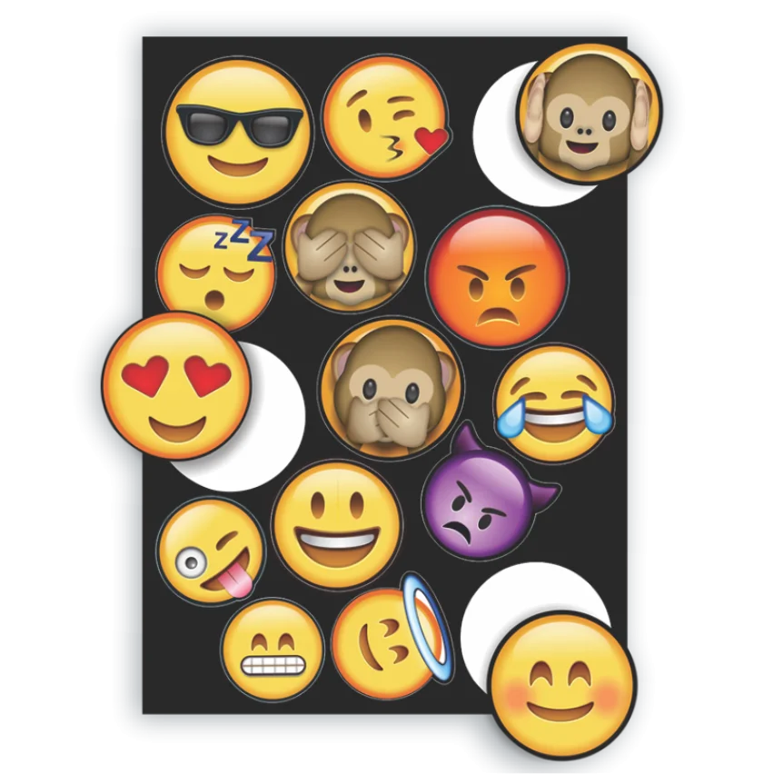 Cartela 23x33cm, adesivos variados de 3x3cm a 9x9cm.