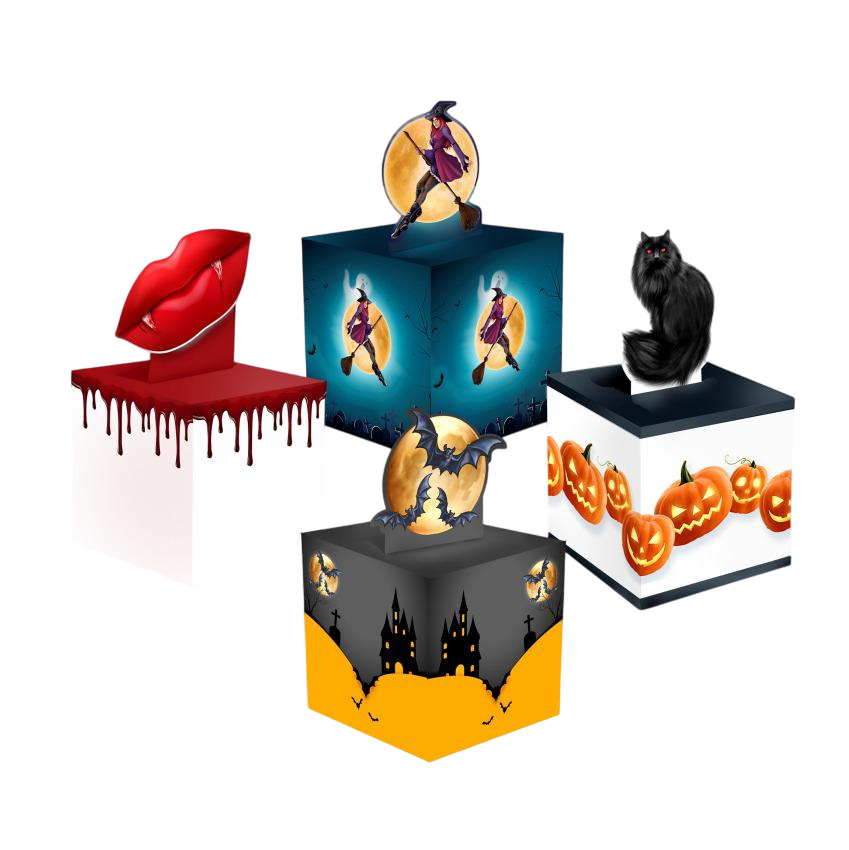 Pequenas caixas decorativas com estampas de Halloween, ideais para lembrancinhas ou decoração de mesa.