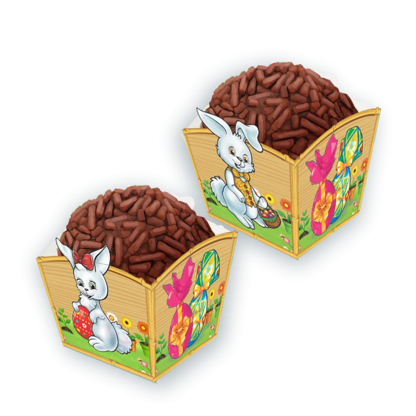 Forminhas para brigadeiro com estampas temáticas de Páscoa.