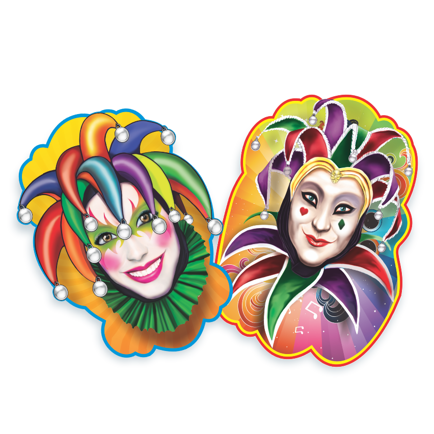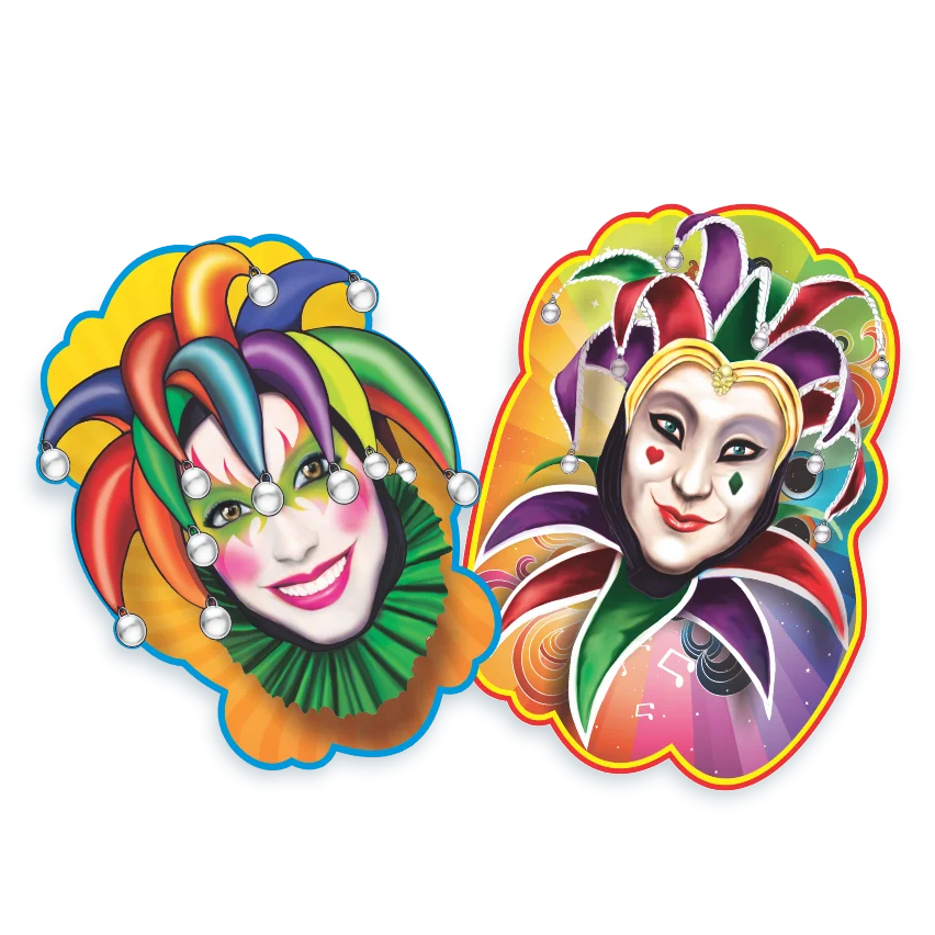 Conjunto decorativo que representa os clássicos personagens do carnaval, trazendo um toque elegante e tradicional à decoração.