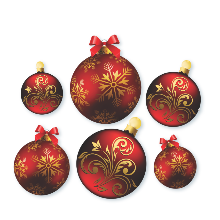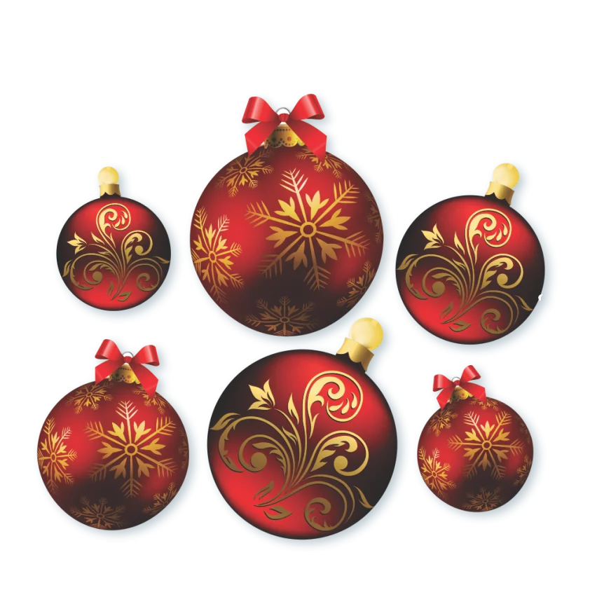 Seis bolas decorativas para árvore de Natal, variando em tamanho para criar composições elegantes.