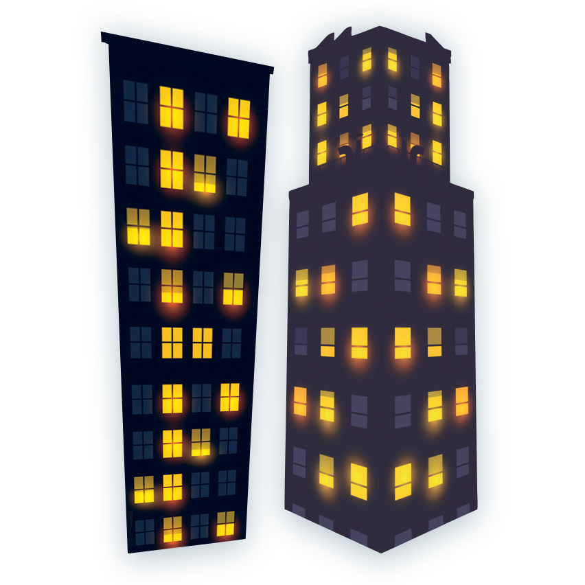 Dimensões: Prédio 1 – 24cm x 58cm, Prédio 2 – 23cm x 68cm.