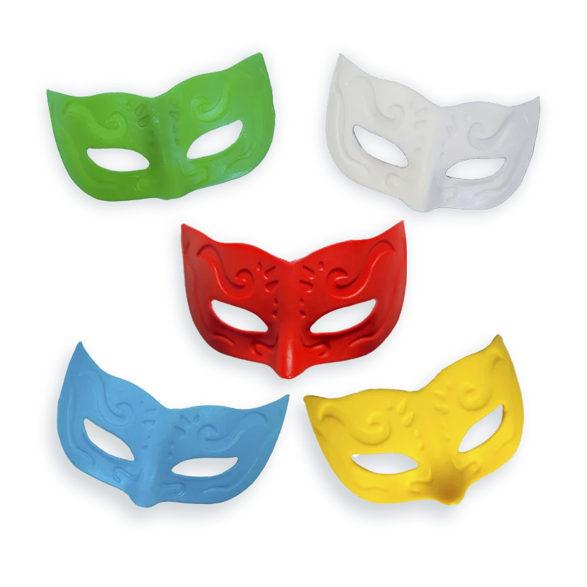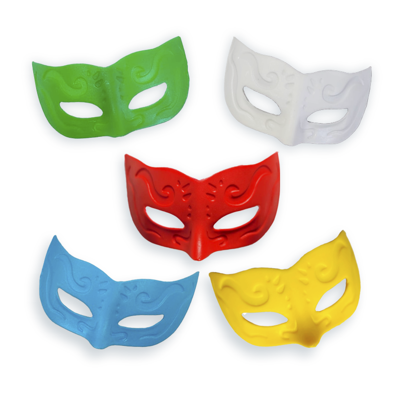 Conjunto de máscaras plásticas pequenas e coloridas, perfeitas para personalizar a folia.