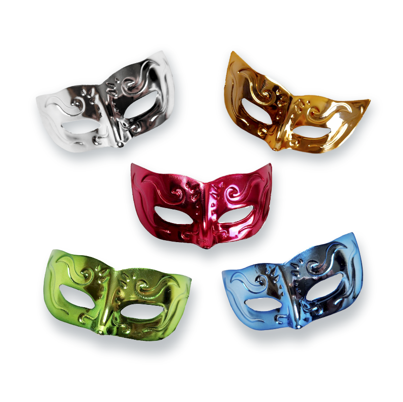 Kit com cinco mini máscaras metalizadas, trazendo brilho e elegância para o carnaval.