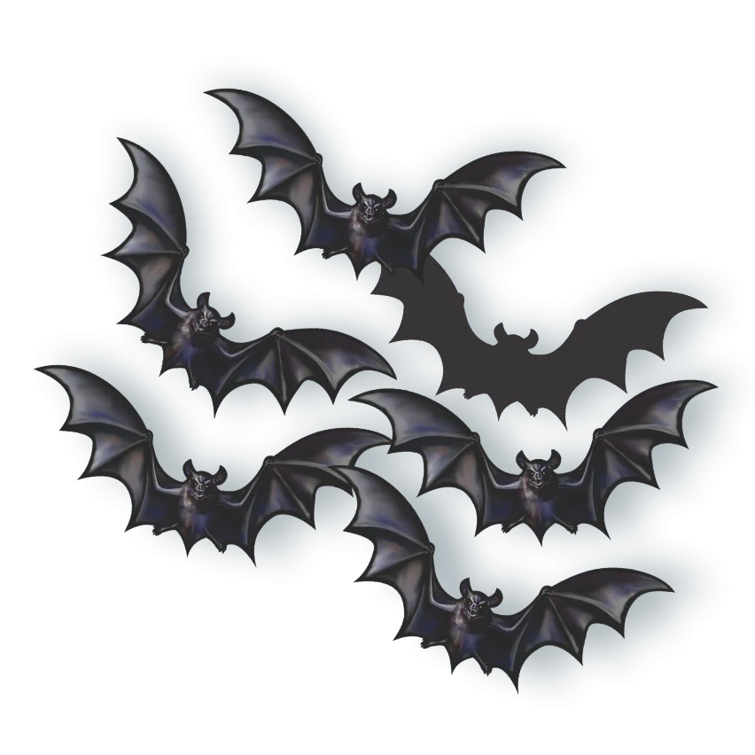 Conjunto de seis morcegos pequenos, ideais para complementar decorações de Halloween e tornar qualquer ambiente mais assustador.